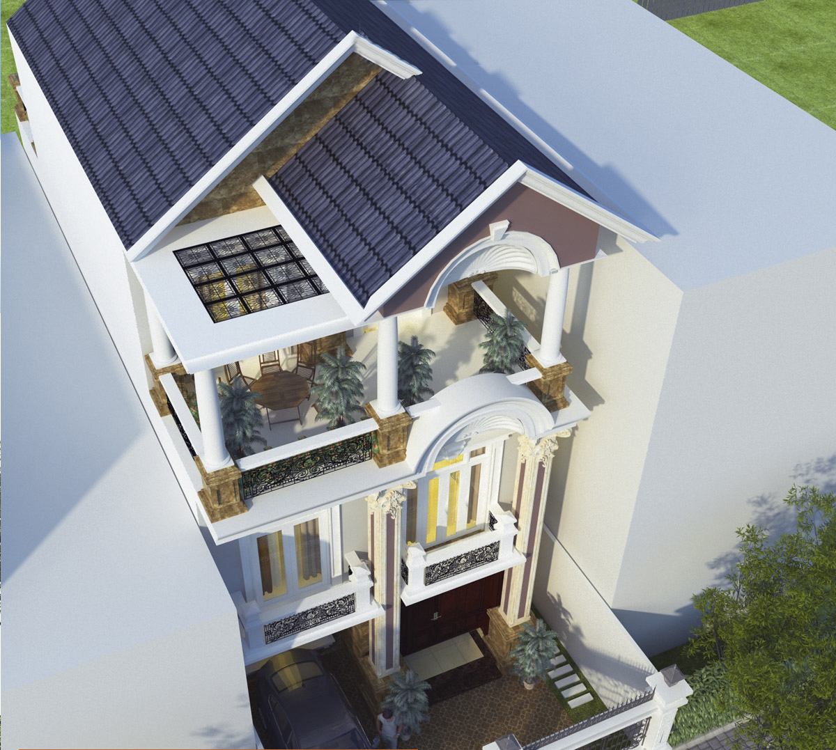 Bên cạnh các thiết kế hiện đại khi nhìn căn biệt thự ở hướng chính diện, chúng ta có thể nhìn thấy được những chi tiết rất "cổ điển" thông qua chi tiết mái ngói ngói nhấp nhô trên các cửa sổ ở hai bên của ngôi nhà. Đúng theo lối thiết kế hiện đại hòa vào thiên nhiên, các ban công hai bên và phí trước ngôi biệt thự sẽ là nơi những thành viên trong gia đình co thể hít thở không khí tươi mát của khí trời vào những buổi sáng sớm hoặc khi đêm về.